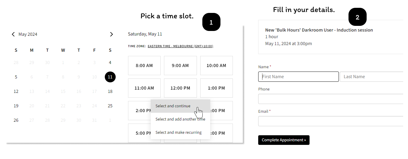 The bulk package is designed to give you bang for your buck and allows you the freedom to use the Darkroom over a period of two months, or until your hours run out. Once you have purchased your bulk hours package, you will be emailed a code to use in the regular hourly bookings section, just keep making bookings with the code and your hours will count down as you go.